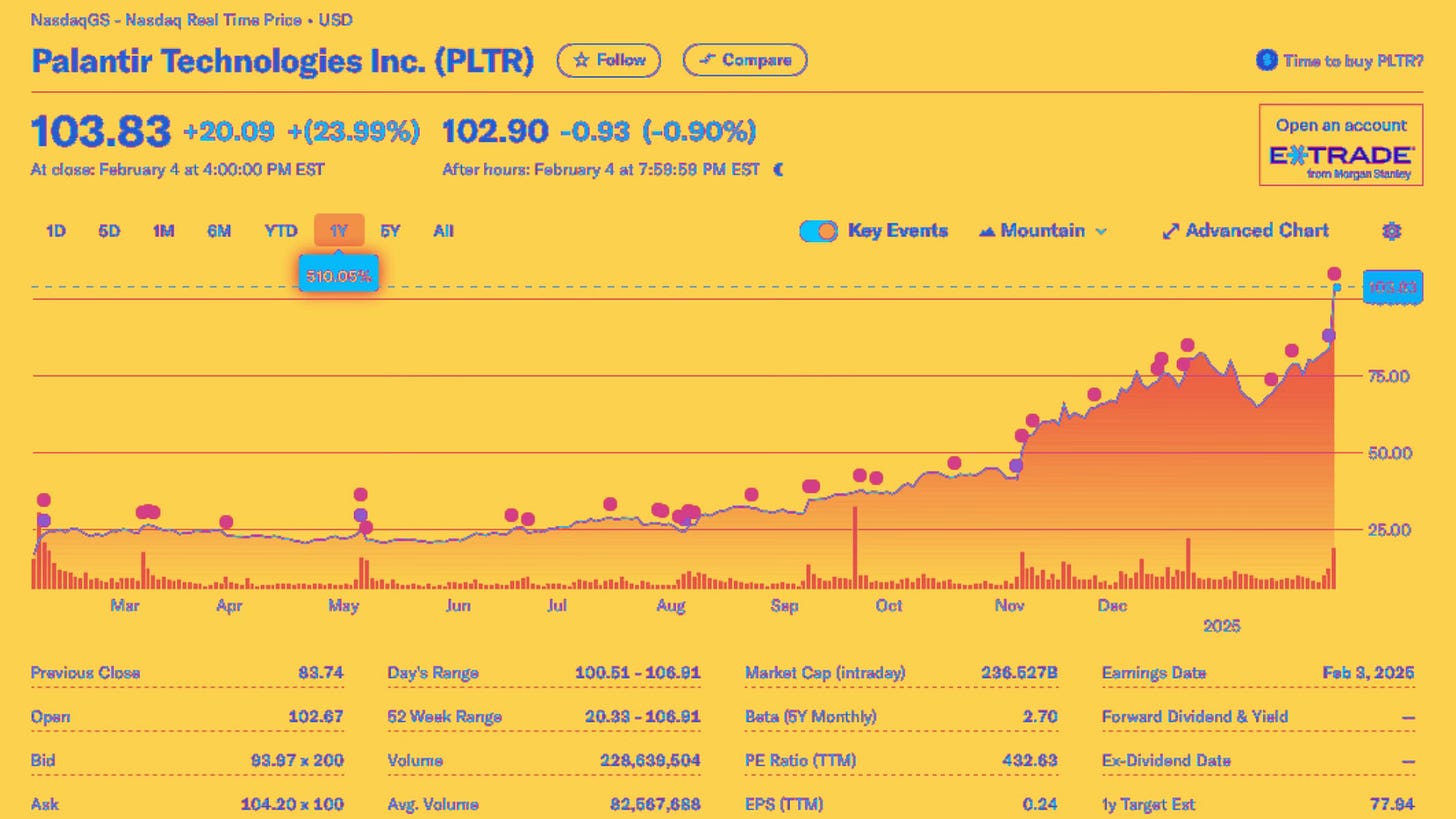 Shares of Denver-based software provider Palantir rose nearly 27% on February 4 following 2024 fourth quarter results featuring faster-than-expected growth and an optimistic forecast for the current quarter and the year 2025.
